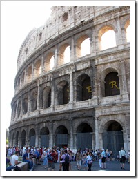 La intrarea în Colosseum e forfotă mare: mii de turiști, de toate națiile, vânzători ambulanți care îți oferă apă, sucuri, bere sau umbreluțe de soare, bărbați îmbrăcați în soldați romani care se îndeamnă să te fotografiezi alături de ei sau ghizi turistici vorbitori de engleză, germană, spaniolă sau alte limbi.