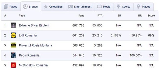 Există mai multe site-uri unde poți vedea diverse clasamente ale paginilor românești de pe Facebook. Unul din referințele în materie de analiză social media este SocialBakers.com Aici avem o secțiune dedicată paginilor românești, secțiune în care observăm încă de la prima încărcare o ”anomalie”: în TOP5 brand-uri din România prezente pe Facebook pe primul loc se află… ”Extreme Silver Bijuterii”. Nu Coca-Cola, nu Pepsi, nu McDonalds.