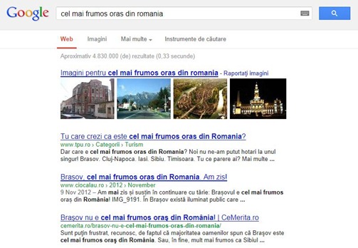 Am fost totuși surprins să constat că articolul a ajuns să fie cel mai accesat articol de pe blog în ultima lună. M-am uitat în Google Analytics și am descoperit că principala sursă de trafic este căutarea „cel mai frumos oras din Romania”. Am căutat, evident, la rândul meu și rezultatul m-a amuzat: