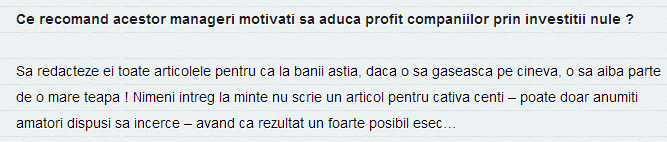 Peste ceva timp, găsesc întâmplător un articol pe un blog în care autorul – cel care m-a contactat și pe care l-am refuzat – deplânge umilința la care l-am supus și faptul că „managerii online din România nu au pic de respect”. Individul expune acolo toată povestea, cum că el scrie texte la prețul „corect” de 8 – 10 euro pe articol și vai ce jignit se simte el că i s-a oferit un preț umilitor de mic (deși repet, el a fost cel care m-a contactat) și la sfârșit concluzionează: